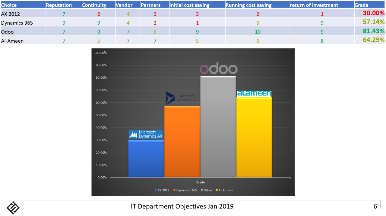 Cần một ERP linh hoạt và có khả năng mở rộng, nhóm CNTT của Fayendra, do Amr dẫn đầu, quyết định tìm kiếm một hệ thống ERP khác, bao gồm cả Odoo, tất cả các chi phí cũng như khả năng của chúng. Họ đã thực hiện công việc so sánh kỹ lưỡng để đảm bảo rằng mình chọn được phương án tốt nhất cho doanh nghiệp.