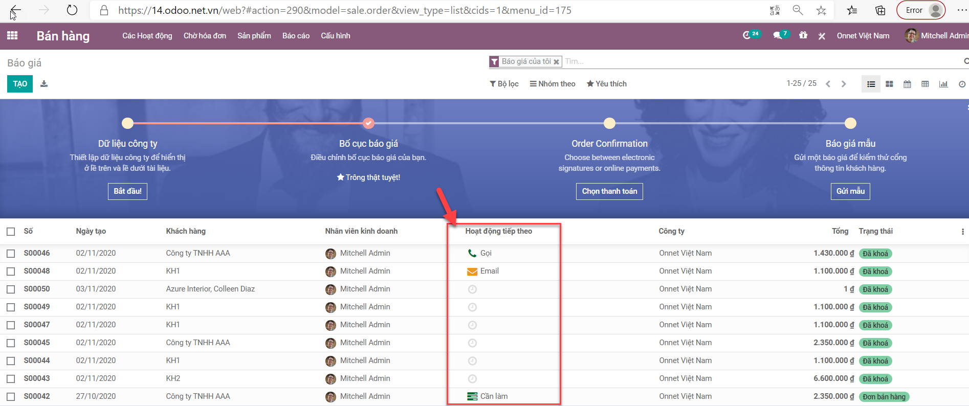 - Hoạt động tiếp theo (Next Activity) là nơi hiển thị các giai đoạn của Đơn đặt hàng (Sale Order). Do đó, ngay tại trang chủ của module Bán hàng, ở chế độ xem danh sách Sale Order, Odoo 14 đã cập nhật thêm cột thông tin Hoạt động tiếp theo để người dùng có thể dễ dàng theo dõi các hoạt động cần thực hiện, cập nhật kết quả hoạt động và thêm mới hoạt động tiếp theo. Dựa vào đó, họ có thể nhanh chóng xử lý và kiểm soát công việc như gửi mail hoặc nhắn tin cho khách hàng bằng chức năng CRM của hệ thống Odoo thay vì sử dụng các hệ thống bên ngoài