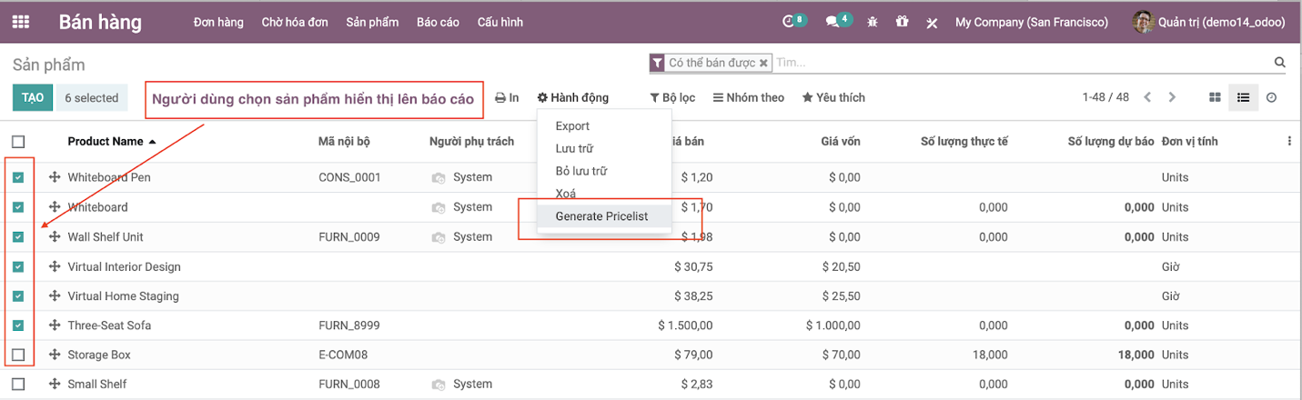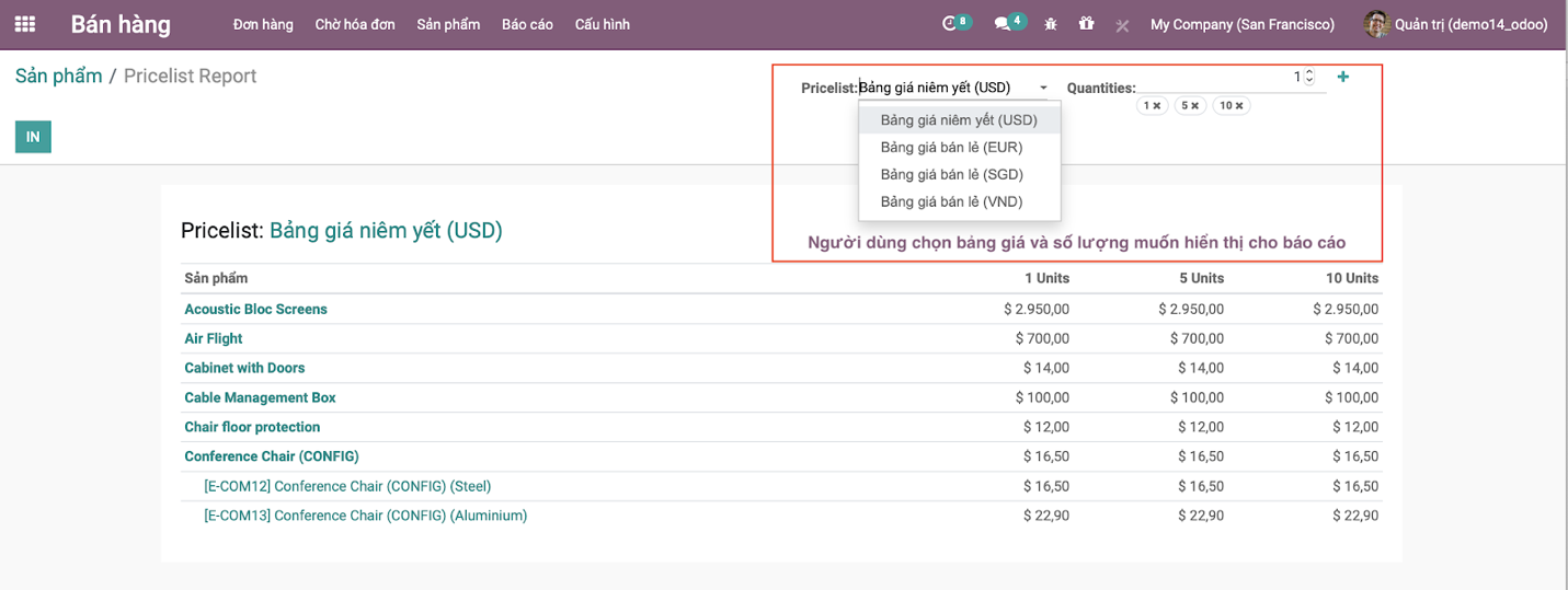 +) Odoo 14 cung cấp cho người dùng tuỳ chọn in bảng giá từ chính danh sách sản phẩm. Tại đây người dùng cũng có thể lựa chọn in bảng giá theo các loại tiền tệ khác nhau nếu người dùng có các loại bảng giá đa tiền tệ