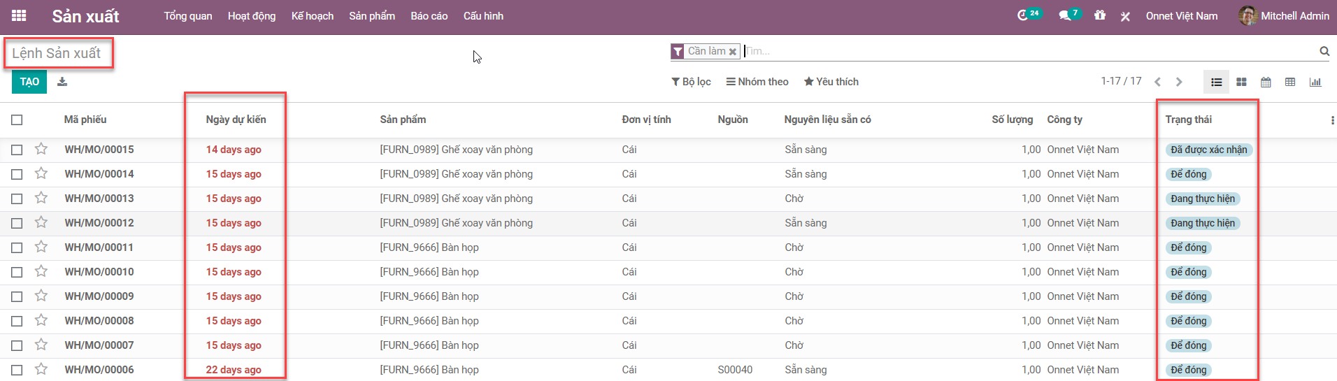 - Với giao diện danh sách Lệnh sản xuất, chúng ta nhận thấy Odoo 14 được cập nhật thêm tình trạng trạng thái đơn sản xuất giúp người dùng kiểm soát được tiến độ thực hiện
