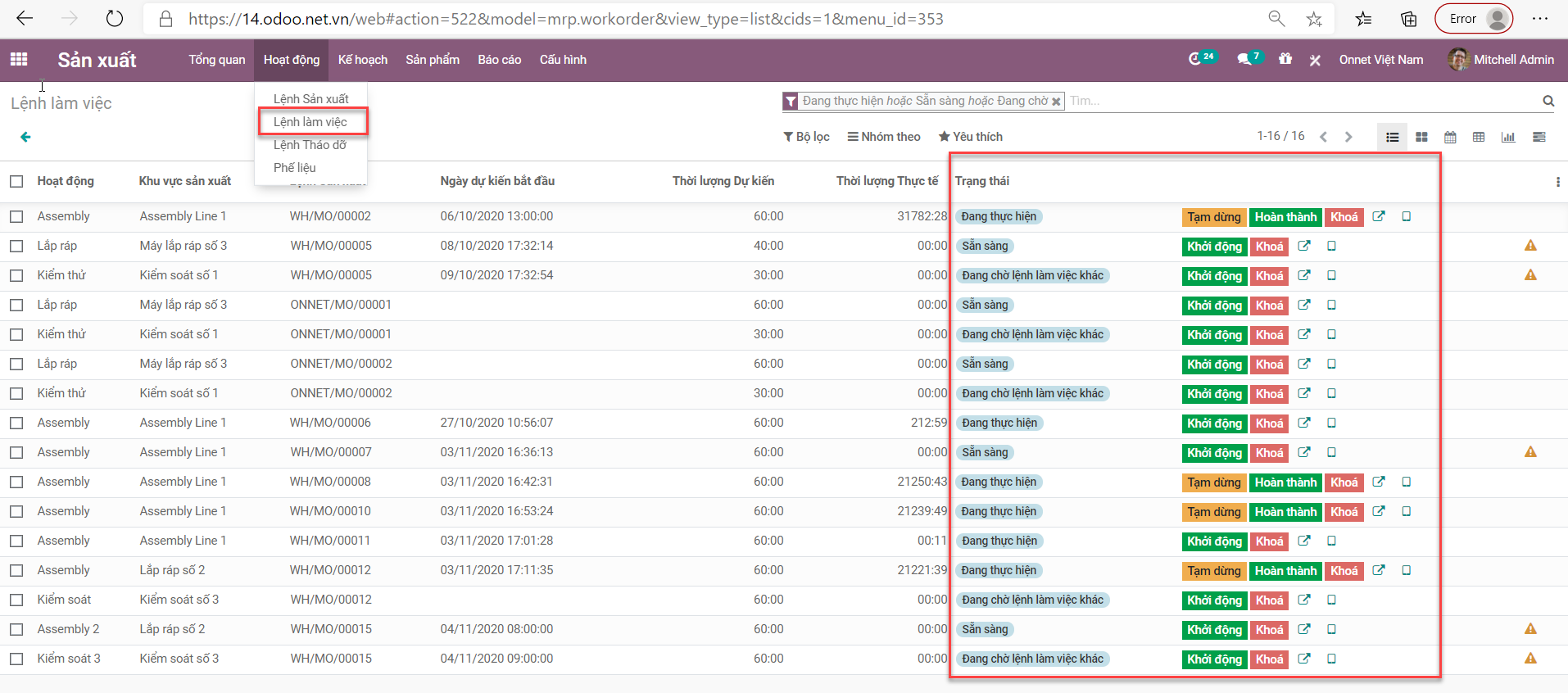 - Trong lệnh công việc, Odoo đã sửa trạng thái các giai đoạn hoạt động tương ứng là Tạm dừng hoặc Hoàn thành hoặc Khóa trên giao diện Danh sách công việc