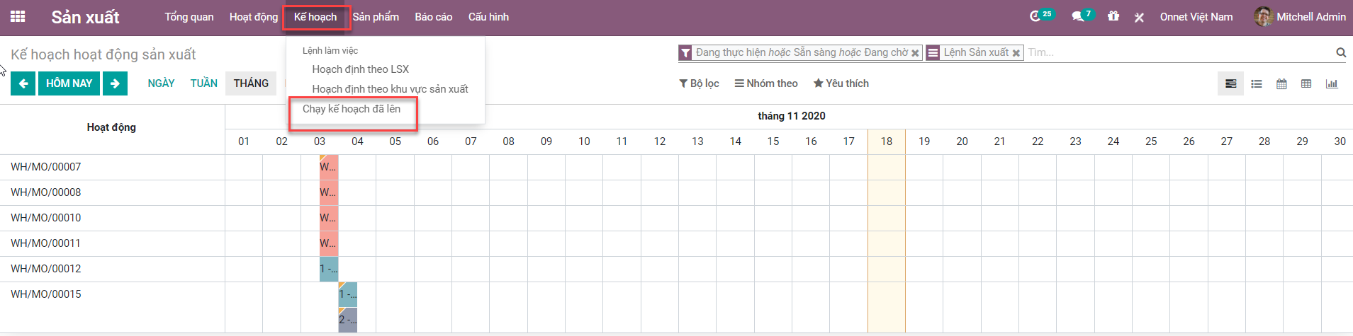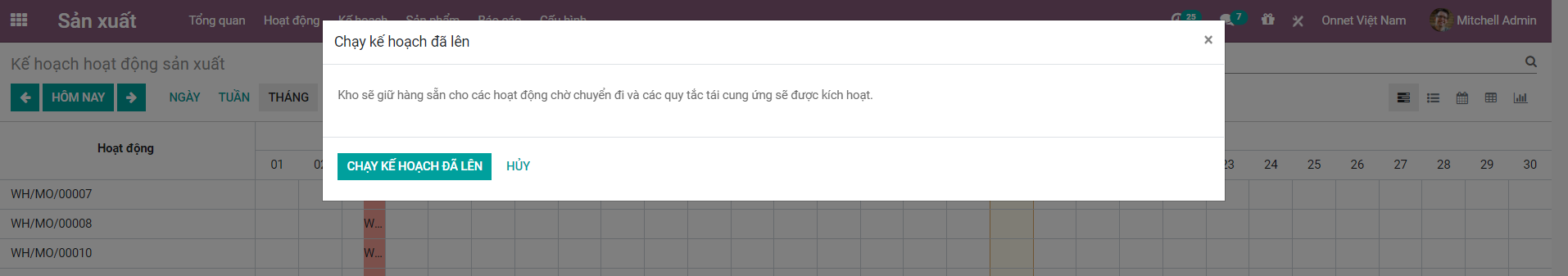 - Chúng ta có thể Chạy kế hoạch đã lên trong menu Kế hoạch để giúp cho Kho chuẩn bị trước nguyên liệu sx