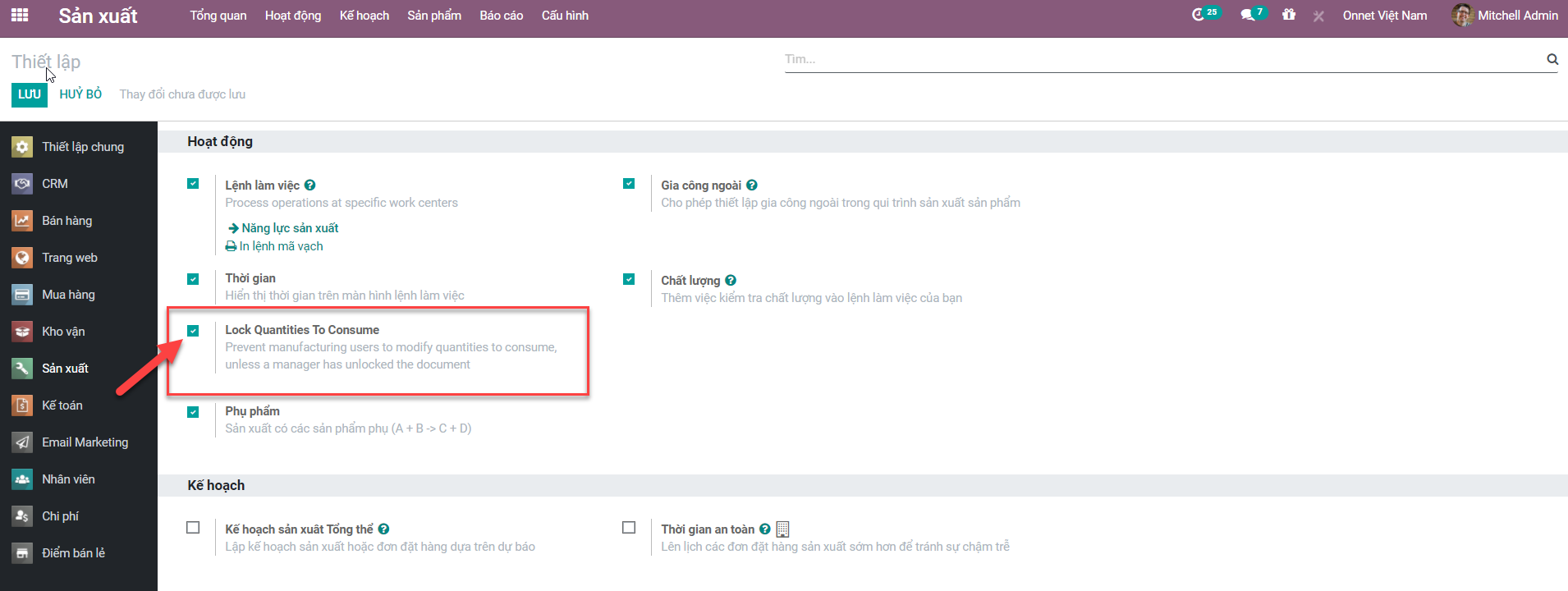 - Khóa số lượng cần tiêu thụ: Odoo 14 mang đến một tính năng mới trong mô-đun Sản xuất để khóa số lượng cần tiêu thụ trong các đơn đặt hàng sản xuất sau khi đơn đặt hàng được xác nhận. Tính năng này ngăn người dùng sửa đổi số lượng để tiêu thụ trừ khi người quản lý đã mở khóa tài liệu. Khi bật tính năng này, nó chỉ áp dụng cho các đơn hàng sản xuất mới tạo, không áp dụng cho các đơn hàng cũ.