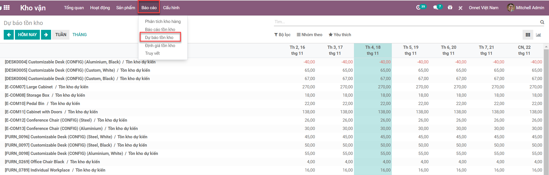 Vào Kho vận -> Báo cáo -> Dự báo tồn kho