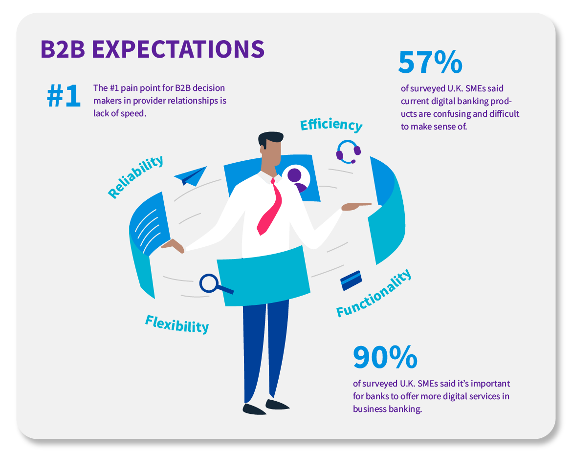 Mỗi cá nhân đều mang đến những sở thích và kỳ vọng riêng đối với các tương tác với ngân hàng, nhưng khách hàng B2B, theo một số cách, khác với các đối tác B2C của họ. Đó là bởi vì các khách hàng B2B phụ thuộc vào các tổ chức tài chính để giúp hỗ trợ và cấu trúc hoạt động kinh doanh của chính họ, tạo cơ hội cho mối quan hệ đối tác sâu sắc hơn.