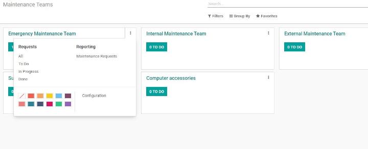 Một đội bảo trì sẽ giúp công ty quản lý tất cả các hoạt động liên quan đến bảo trì một cách có hệ thống. Nhóm sẽ đảm bảo hỗ trợ để xóa tất cả các yêu cầu bảo trì trên cơ sở tình trạng khẩn cấp hoặc mức độ ưu tiên của yêu cầu. Nó sẽ giúp liệt kê và lên lịch các nhiệm vụ bảo trì khác nhau và quản lý các nhiệm vụ mà không bỏ sót các nhiệm vụ. Vì tất cả các công việc Cần làm sẽ được liệt kê trong chế độ xem Nhóm bảo trì Odoo, các thành viên trong nhóm chắc chắn đã thông báo tất cả các yêu cầu bảo trì và hoàn thành công việc sửa chữa.
