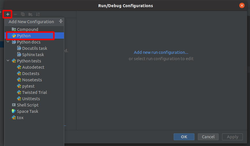 Sau đó, hộp thoại sau sẽ xuất hiện, nhấp vào nút ‘+’ và chọn ‘Python’ từ danh sách