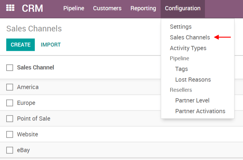 Mỗi nhóm bán hàng có thể có bí danh email riêng để tạo khách hàng tiềm năng / cơ hội tự động được gán cho nhóm đó. Sẽ rất hữu ích nếu bạn quản lý một số nhóm bán hàng với các quy trình kinh doanh cụ thể. Bạn sẽ tìm thấy cấu hình của các nhóm bán hàng trong Cấu hình -> Nhóm Bán hàng.