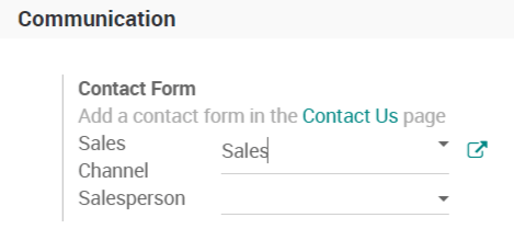 Để thay đổi sang một kênh bán hàng cụ thể, hãy chuyển đến Trang web -> Cấu hình ->  Cài đặt trong Liên lạc, bạn sẽ tìm thấy thông tin Biểu mẫu liên hệ và nơi thay đổi Kênh bán hàng hoặc Nhân viên bán hàng.
