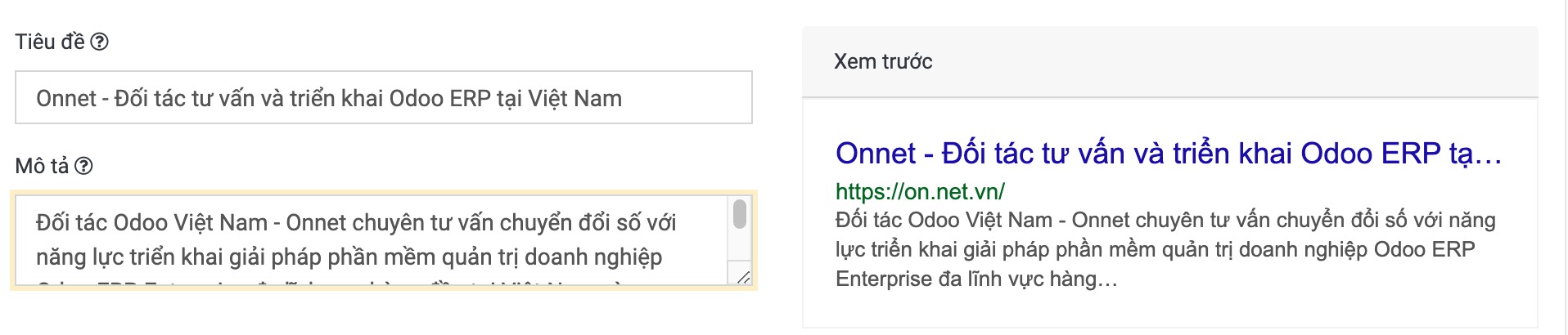 Khi nói đến SEO, nội dung luôn được nhắc đến như là "ông vua" của SEO. Như bạn thấy đấy, Onnet Consulting dành rất nhiều thời gian để tổng hợp và thực hiện bài viết này, mục tiêu cuối cùng là để giúp doanh nghiệp bạn tăng chất lượng SEO và tiếp cận đến khách hàng. Odoo cung cấp một số tính năng rất hay để giúp bạn xây dựng nội dung trang tối ưu: