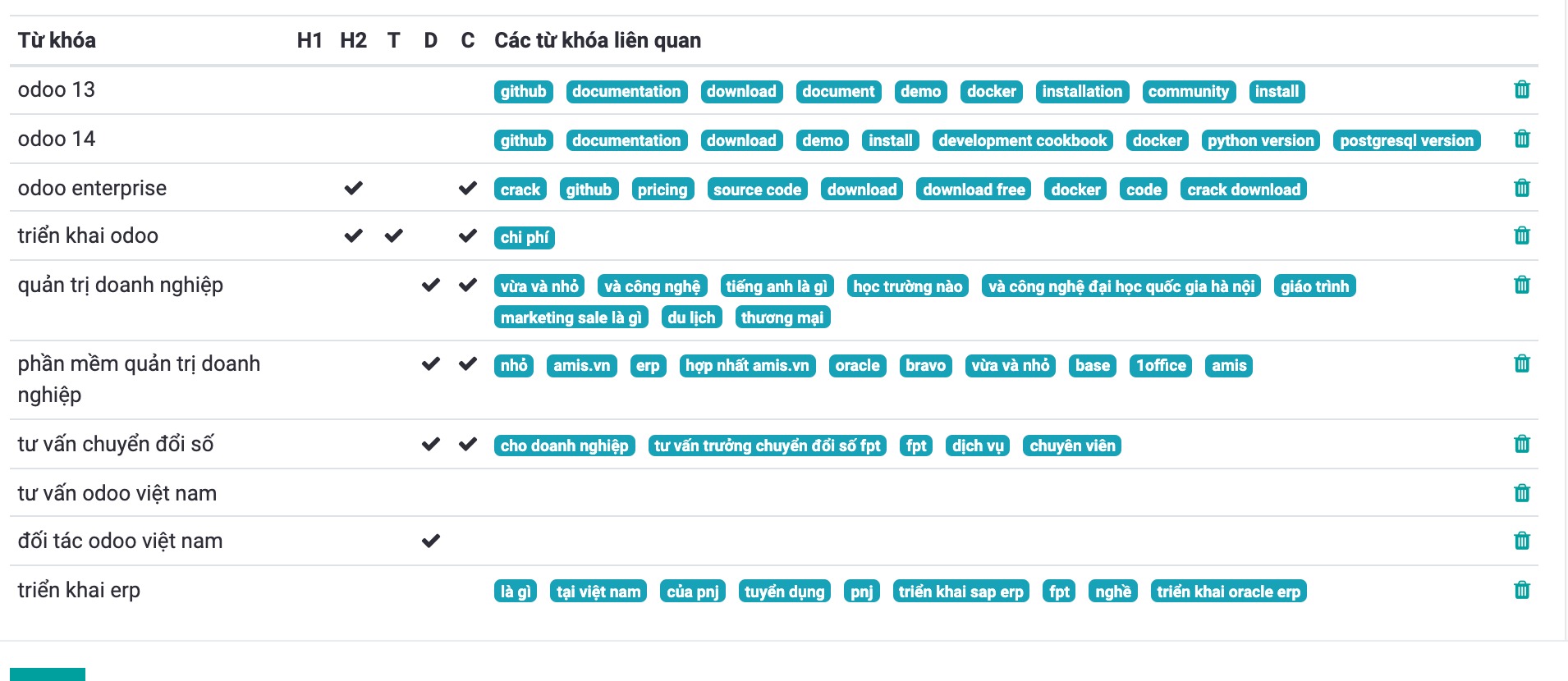 Để viết nội dung chất lượng và tăng lưu lượng truy cập của bạn, Odoo cung cấp công cụ tìm <từ khóa>. Những từ khóa đó là những tìm kiếm bạn muốn hướng đến trang web của mình. Đối với mỗi từ khóa, bạn sẽ thấy nó được sử dụng như thế nào trong nội dung (H1, H2, tiêu đề trang, mô tả trang, nội dung trang) và những tìm kiếm liên quan trong Google là gì. Càng nhiều từ khóa được sử dụng càng tốt. Điểm đặc biệt là Odoo cho phép bạn định nghĩa từ khóa theo ngôn ngữ rất tiện dụng.