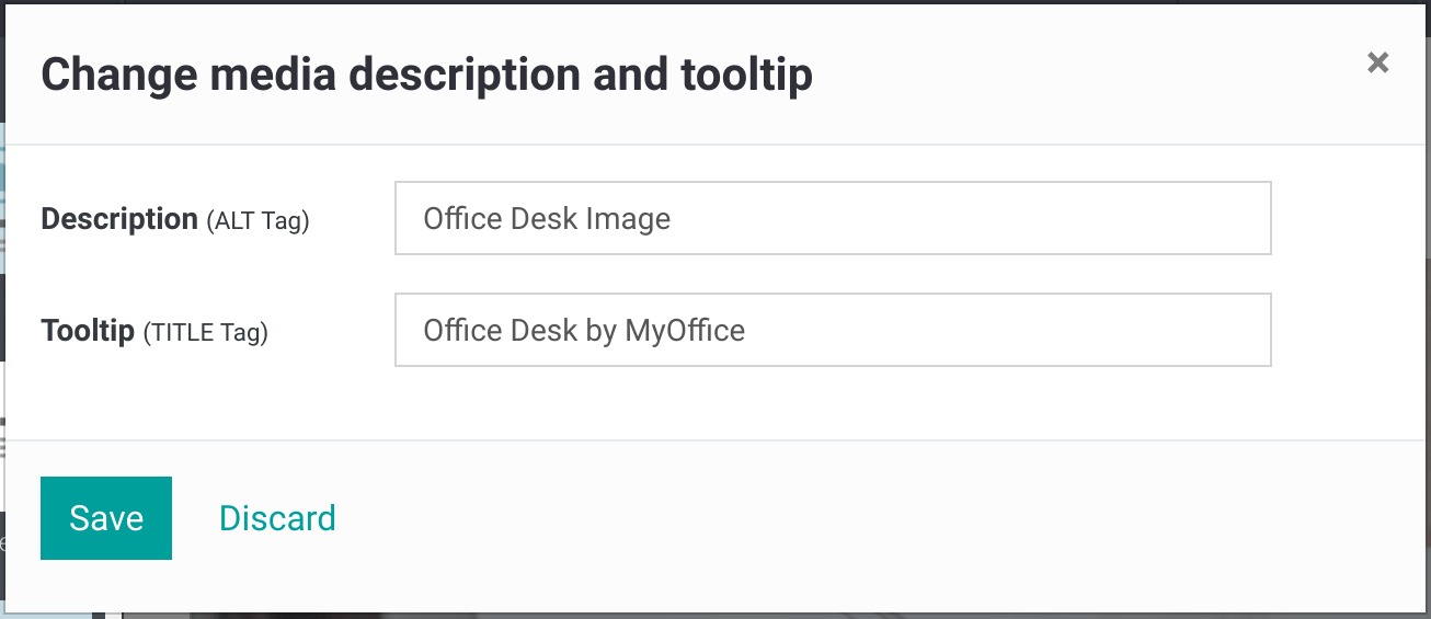 Khi bạn nhấp vào một hình ảnh, Odoo sẽ hiển thị cho bạn các thuộc tính Alt và title của thẻ <img>. Bạn có thể nhấp vào nó để đặt tiêu đề và thuộc tính Alt của riêng bạn cho hình ảnh.