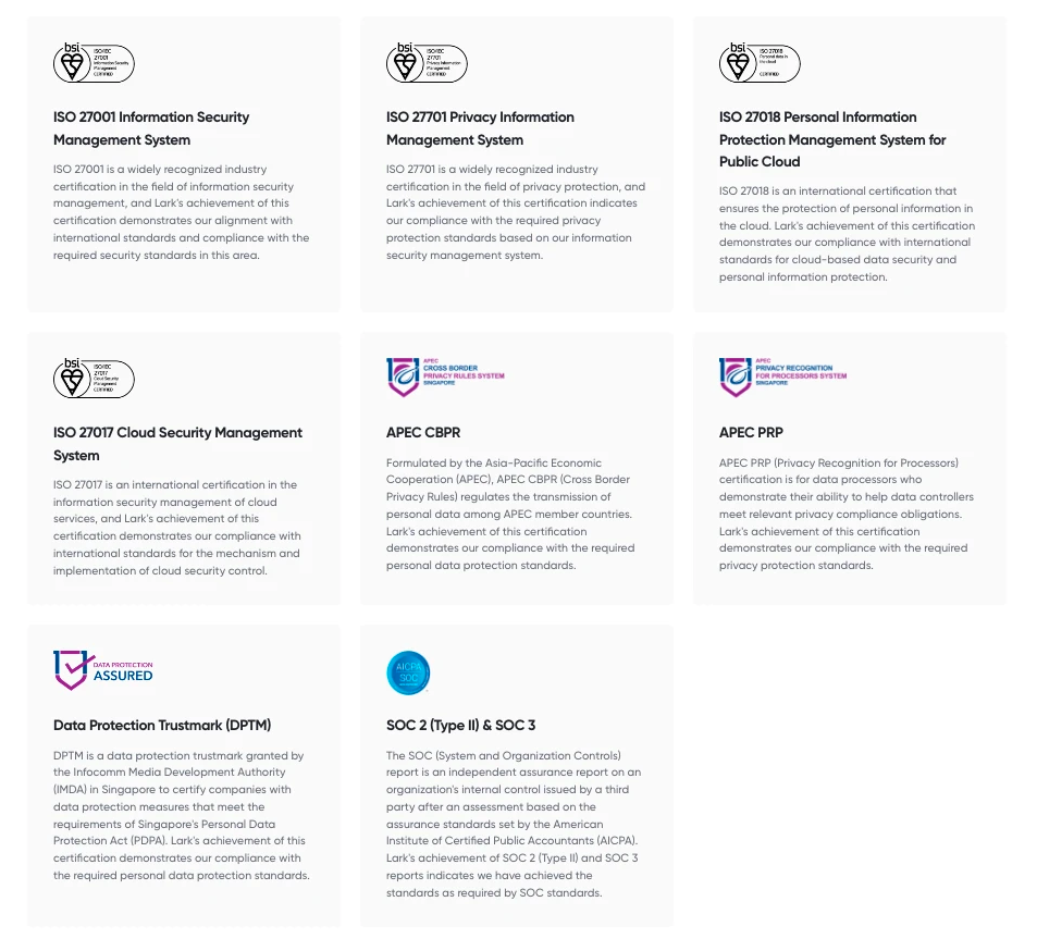 Lark tuân thủ các tiêu chuẩn SOC 2 & SOC 3, đồng thời đã đạt được nhiều chứng nhận về bảo mật thông tin, quản lý thông tin quyền riêng tư, bảo mật đám mây và bảo mật xuyên biên giới, đồng thời, dữ liệu của Lark được lưu trữ trên Amazon Web Services (AWS). Bạn có thể tìm thêm thông tin về tuân thủ và bảo mật dữ liệu của Lark trong Trung tâm tin cậy của Lark.