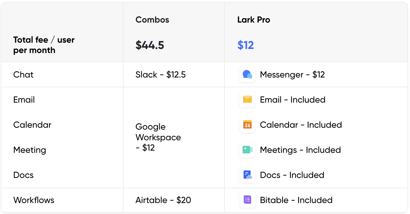 Ví dụ, để đáp ứng nhu cầu cho một công ty có 100 nhân viên và làm việc chủ yếu trên máy tính, một doanh nghiệp có thể phải trả thêm 271% nếu họ mua các gói dịch vụ trả phí cho Slack + Google Workspace + Airtable, so với nếu họ sử dụng gói dịch vụ trả phí của Lark để vẫn đáp ứng được tất cả các chức năng mà đội nhóm cần.