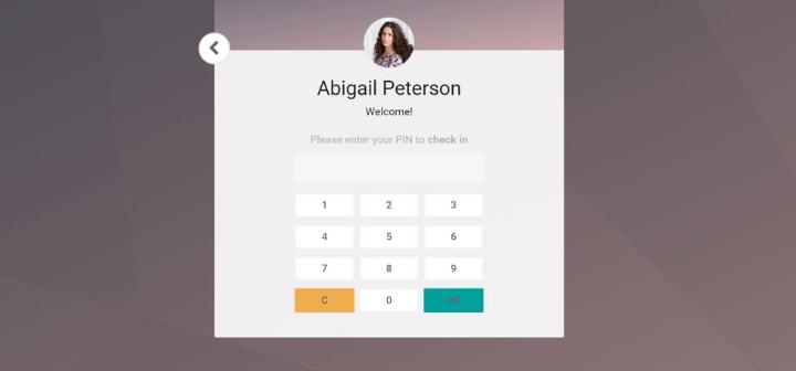 Nhân viên có thể vào chế độ kiosk và tùy chọn quét mã vạch hoặc nút xác nhận thủ công. Máy quét mã vạch sẽ quét thẻ ID của nhân viên như hình trên. Việc này được ghi lại để đánh dấu sự có mặt của họ. Nếu chọn xác nhận thủ công, họ sẽ được chuyển hướng đến bảng điều khiển nhân viên, nơi họ có thể chọn thẻ nhân viên tương ứng của mình và nhập mã pin.
