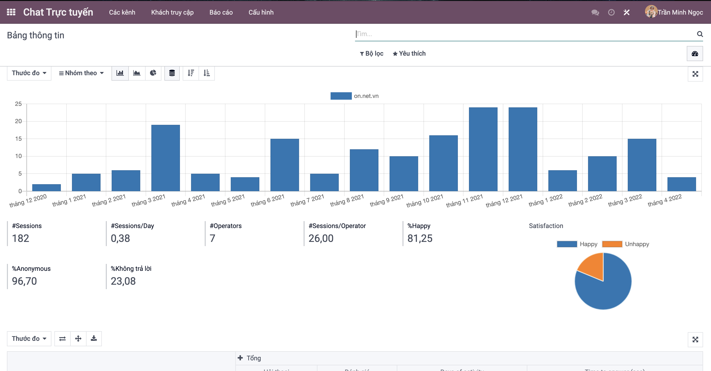 Nền tảng Live Chat hỗ trợ người dùng phân tích dựa trên số lượng phiên, thời lượng trung bình, số lượng và thời gian trả lời. Chúng tôi có thể xem tổng số thời lượng và phiên trung bình trong bảng tổng hợp ở chế độ xem Tổng hợp.