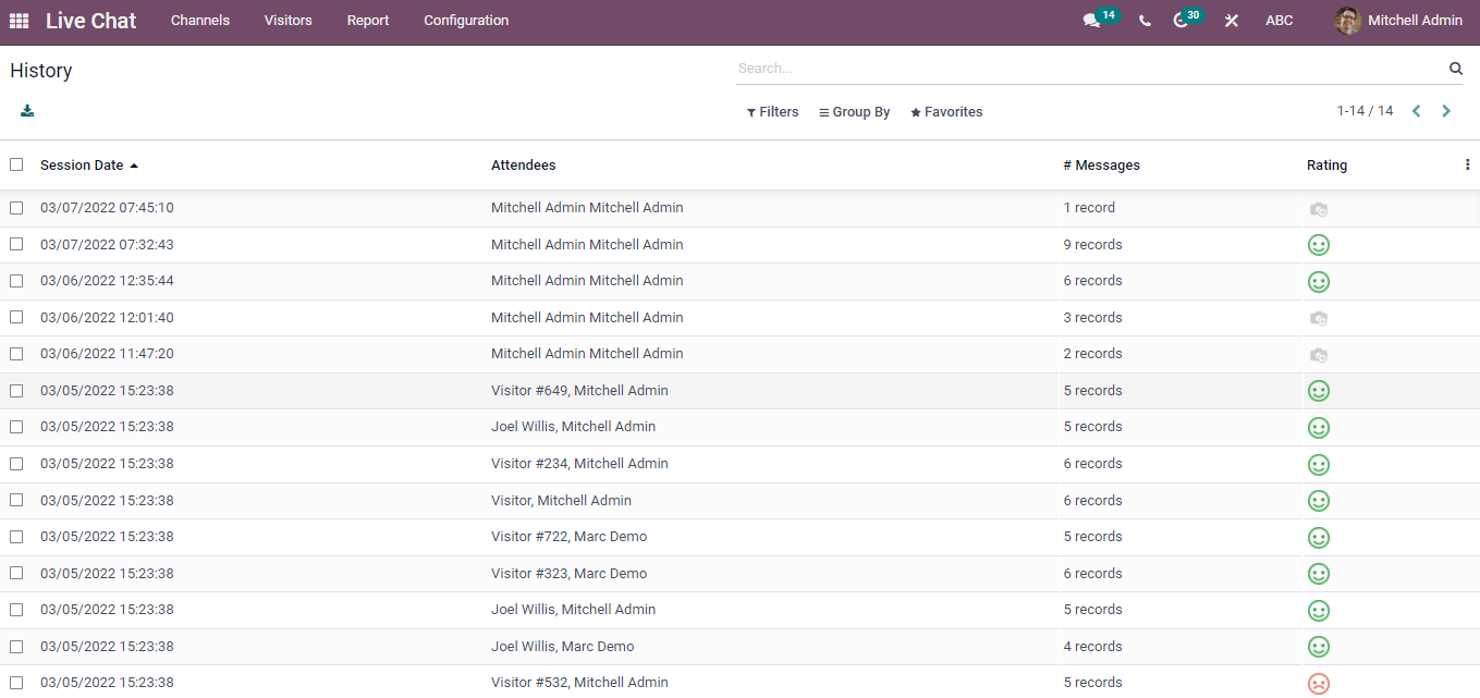 Khách truy cập có thể đánh giá trang web dựa trên phản hồi của bạn. Bạn có thể truy cập Đánh giá của khách hàng bằng bảng điều khiển Trò chuyện trực tiếp của Odoo 15. Trong trang Đánh giá của khách hàng, chúng ta có thể biết về thông tin liên quan đến khách hàng, ngày, giờ đã gửi, nhà điều hành xếp hạng và xếp hạng được mô tả trong ảnh chụp màn hình bên dưới.