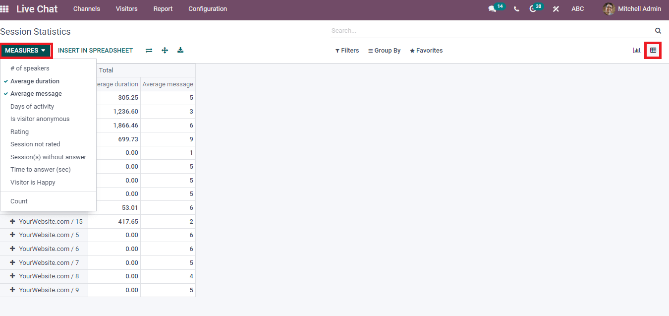 Người dùng có thể phân tích Lịch sử phiên, Đánh giá của khách hàng và Thống kê phiên thông qua nền tảng Trò chuyện trực tiếp Odoo 15. Để làm được điều này, hãy nhấp vào tab Báo cáo trong trang tổng quan và bạn có thể phân tích tất cả các chi tiết đã cho ở trên.