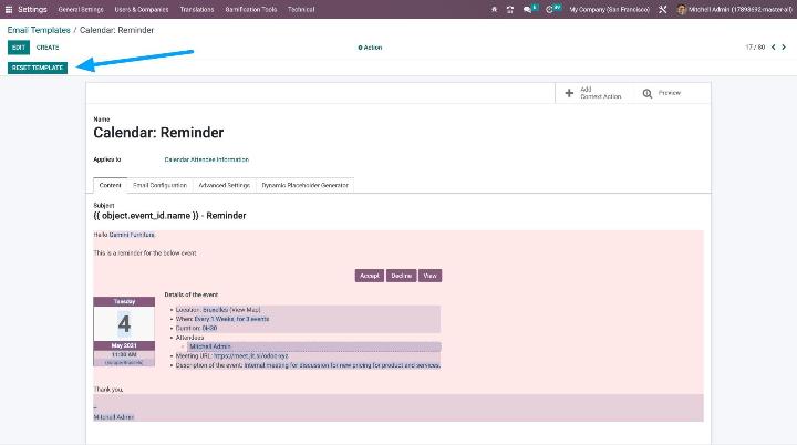 - Odoo 16 Marketing sẽ có nút "Reset Templete" cho các mẫu mail/sms. Nó sẽ đặt lại tất cả các trường (chủ đề, nội dung, từ, đến, v.v.)