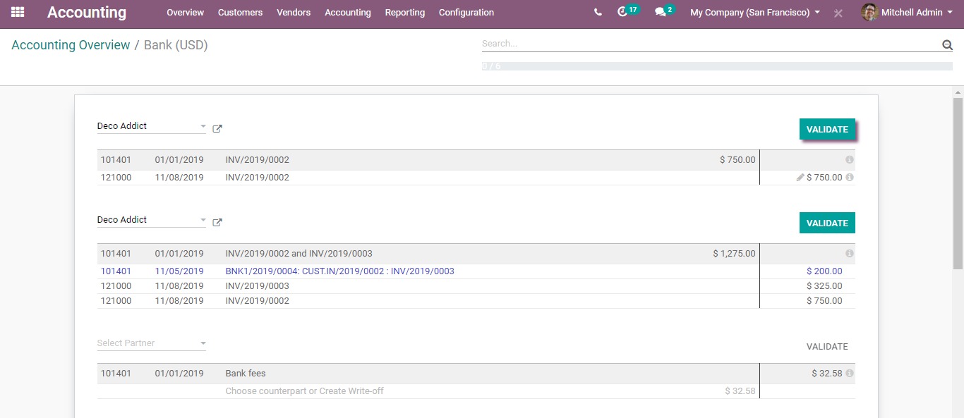 Thật may mắn cho người dùng Odoo khi hệ thống này cung cấp đầy đủ công cụ cho bạn thực hiện công việc này một cách dễ dàng. Odoo cho phép dễ dàng liên kết các hóa đơn của bạn và tất cả các chi tiết thanh toán khác với bảng sao kê ngân hàng mà không gặp khó khăn. Các phương pháp đối chiếu trong Odoo được thực hiện ở hai định dạng: