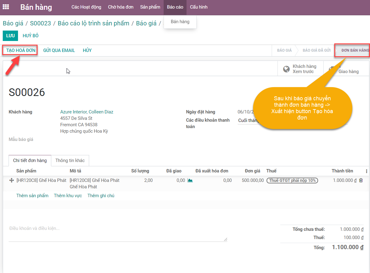 Bước 2: Xác nhận báo giá sau khi điền đầy đủ thông tin chi tiết. Sau khi báo giá chuyển sang trạng thái Đơn bán hàng, hệ thống hiển thị button Tạo hóa đơn