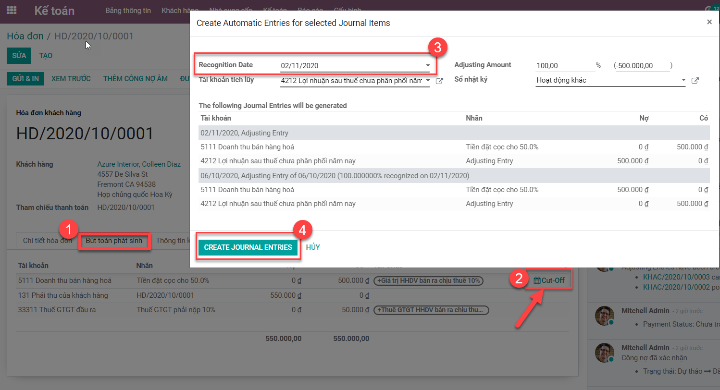 Trong phần Hóa đơn, so với Odoo 13 thì trên Odoo 14 có bổ sung thêm tính năng cut-off giúp cho người dùng có thể thay đổi ngày ghi nhận doanh thu (chỉ áp dụng khi các bút toán đã được vào sổ)
