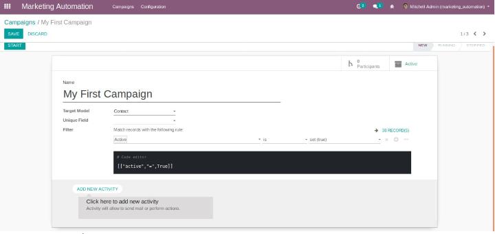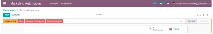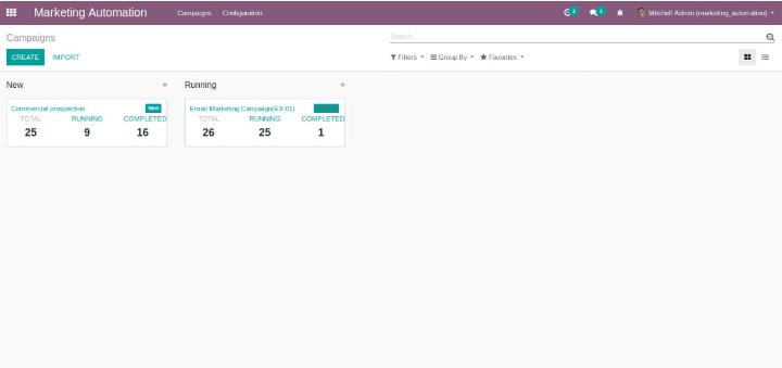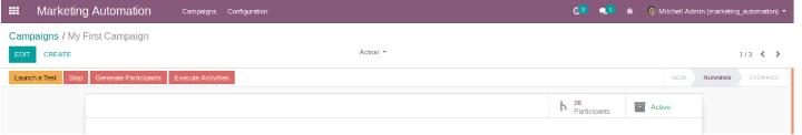 Bằng cách nhấp vào biểu tượng, ứng dụng Odoo Marketing Automation sẽ dẫn đến một trang hiển thị các chiến dịch đã tạo, trạng thái của nó, các tùy chọn để tạo và cấu hình các chiến dịch mới.