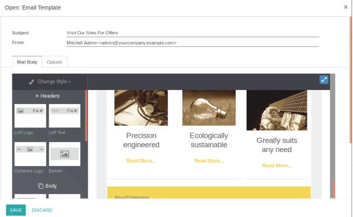 Odoo Marketing Automation tạo ra các chiến dịch tiếp thị tự động và nhắm mục tiêu. Tính năng này giúp tự động hóa các quy trình công việc và từ đó mở rộng quy mô kinh doanh. Ứng dụng giúp đơn giản hóa các hoạt động của khách hàng từ đầu đến cuối, thiết kế các chiến dịch email hấp dẫn và các mẫu email cần thiết. Để có thể kích hoạt bất kỳ hành động nào trong Marketing Automation thì đều đòi hỏi sự hợp lý của quy trình nghiệp vụ.