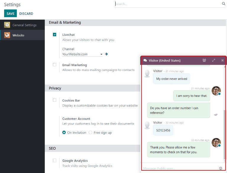 • Trò chuyện trực tiếp có thể được truy cập từ bất kỳ mô-đun nào, trên front-end và back-end, để theo dõi từng cuộc trò chuyện.