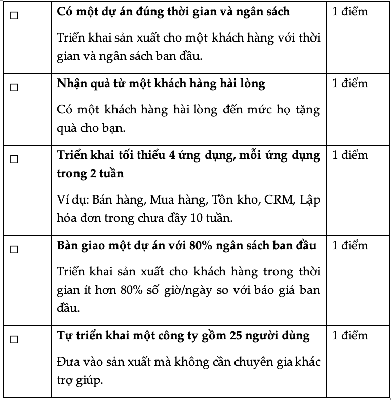 Việc đăng ký của Odoo tốn chi phí thấp hơn khoảng 7 lần so với mức giá công khai của đối thủ cạnh tranh. Mức giá này vừa tuyệt vời vừa rủi ro: khách hàng có thể nghĩ rằng chúng tôi là một sản phẩm “rẻ tiền”.
