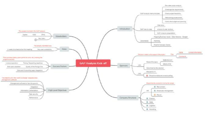 Sử dụng XMind để ghi chú trong cuộc họp ROI – Khởi động dự án với SPoC và những người ra quyết định. Với mẫu này, hãy bắt đầu từ phần “Giới thiệu” nằm trên cùng bên phải và di chuyển theo chiều kim đồng hồ trong cuộc phỏng vấn (các nút bên trái dành cho ghi chú được viết trong các cuộc thảo luận).