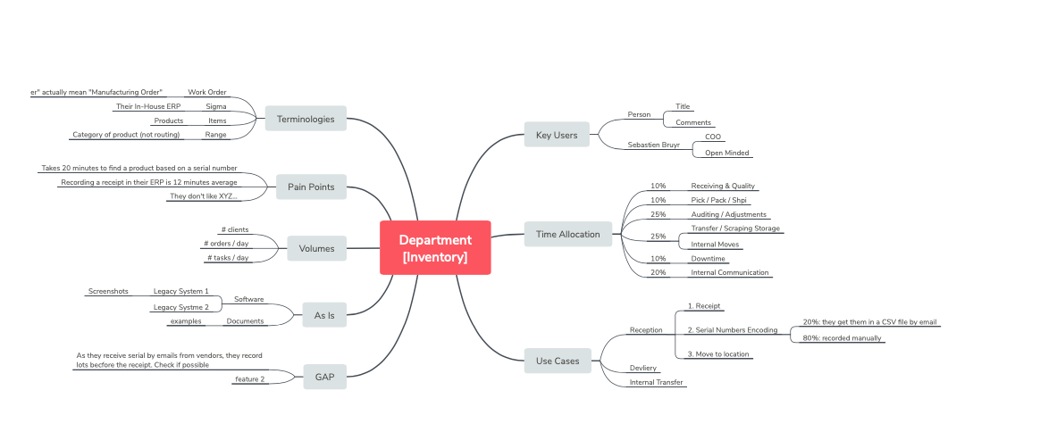Sử dụng XMind để ghi chú trong các cuộc họp với những người dùng chính. Với mẫu này, hãy bắt đầu từ phần “Mọi người” nằm trên cùng bên phải và di chuyển theo chiều kim đồng hồ trong cuộc phỏng vấn (các nút bên trái dành cho ghi chú được viết trong các cuộc thảo luận).