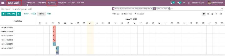 Odoo 14 giúp quản lý lên kế hoạch cho mọi hoạt động sản xuất dựa trên trình tự công việc. Các hoạt động có thể được lên lịch dựa trên yêu cầu về giờ làm việc và đơn đặt hàng sản xuất. Công việc có thể được sắp xếp theo lịch. Việc lập kế hoạch có thể được thực hiện trong một ngày, một tuần, một tháng hoặc một năm.