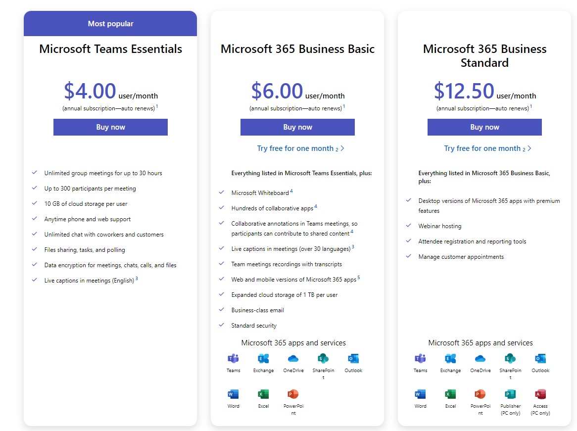Mặt khác, Microsoft Teams cũng cung cấp phiên bản miễn phí với các tính năng cơ bản như nhắn tin, cuộc gọi âm thanh và video cũng như chia sẻ tệp. Tuy nhiên, đối với các tính năng nâng cao hơn như tích hợp với Microsoft Office, lên lịch cuộc họp cũng như các tính năng tuân thủ và bảo mật nâng cao, Microsoft Teams cung cấp các gói trả phí.