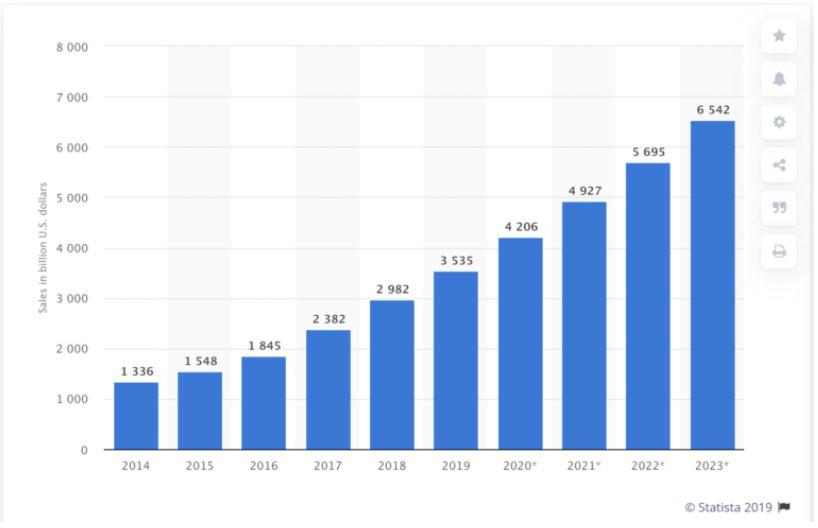 Theo thống kê từ Statista, doanh số thương mại điện tử trên toàn thế giới lớn hơn 3,5 tỷ đô la vào năm 2019 và tăng nhanh vào những năm tiếp theo. Đến năm 2023, doanh số dự kiến sẽ đạt 6,5 tỷ đô la, tức là tăng gần gấp đôi chỉ sau 4 năm. Một con số khổng lồ.