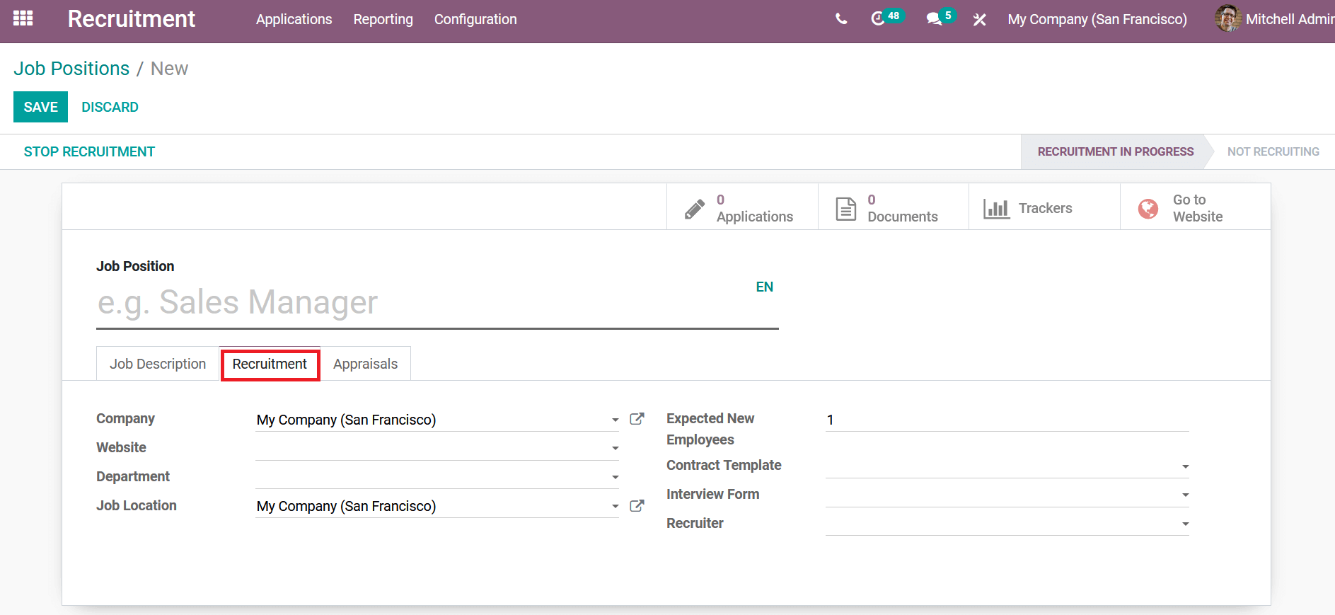 Trong cửa sổ tạo tin tuyển dụng, bạn có thể cung cấp tên của Vị trí công việc và thiết kế mô tả tương tự. Hơn nữa, trong menu tuyển dụng, bạn có thể chỉ định công ty, trang web, phòng ban và Vị trí công việc. Ngoài ra, có thể xác định Nhân viên mới dự kiến, Mẫu hợp đồng, Mẫu phỏng vấn cũng như Người tuyển dụng.