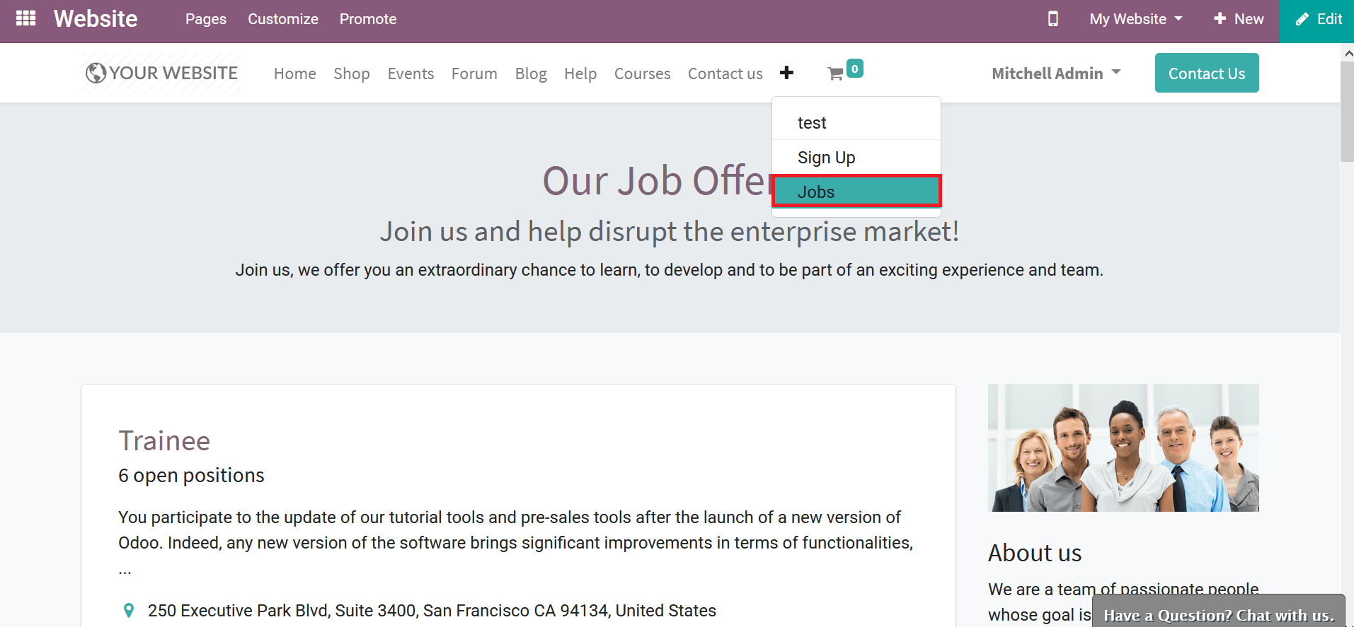 Sau khi lưu Tin tuyển dụng, bạn có thể xem công việc tương ứng đang được mô tả trên trang web của công ty. Trong cửa sổ Công việc như được mô tả trong hình ảnh sau đây. Trong trường hợp bạn chưa có trang Việc làm, bạn có thể tạo một trang mới bằng cách chọn tùy chọn mới có sẵn và chọn để tạo một trang. Và sau đó các tin tuyển dụng được mô tả ở phần cuối của nền tảng sẽ được tự động gán cho nó.
