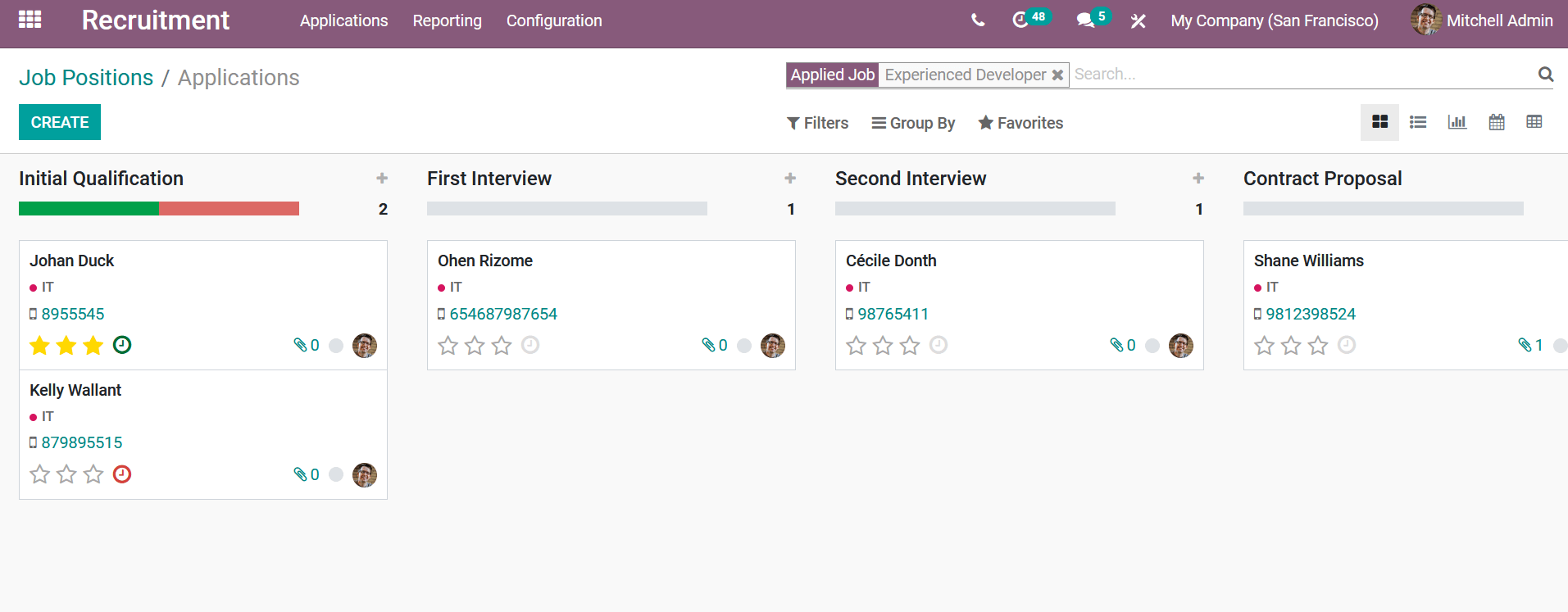 Bạn có thể chọn tin tuyển dụng tương ứng và sẽ được mô tả cùng với ứng dụng về công việc đã được mô tả dựa trên các giai đoạn mà họ đã hoàn thành. Hơn nữa, các giai đoạn được mô tả ở đây có thể được thêm, bớt cũng như sửa đổi. Ngoài ra, mỗi ứng dụng có thể được chuyển từ giai đoạn này sang giai đoạn khác chỉ bằng cách xem và kéo. Các giai đoạn khác nhau của quy trình tuyển dụng nhân viên có thể do bạn xác định và quy trình này có thể theo nhu cầu của bạn và quy trình phỏng vấn đã xác định.