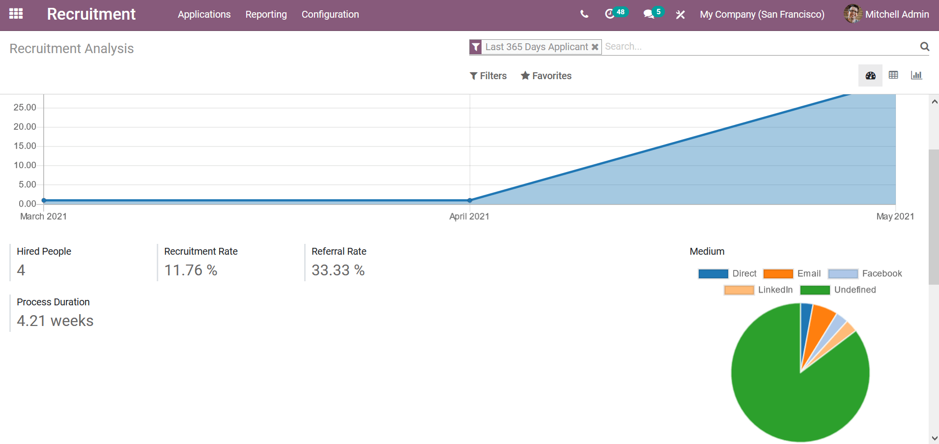 Ngoài ra, bạn có thể cấu hình nhiều phương tiện khác nhau cho các ứng dụng việc làm như Email, Facebook, Linkedin hoặc bất kỳ trang web đăng tuyển nào khác được cấu hình với Odoo. Do đó, khi các ứng viên nộp đơn thông qua các phương tiện đó, đơn xin việc cũng sẽ được mô tả trong nền tảng Odoo. Khía cạnh báo cáo mà phương tiện thông qua đơn xin việc nhận được cũng được mô tả.