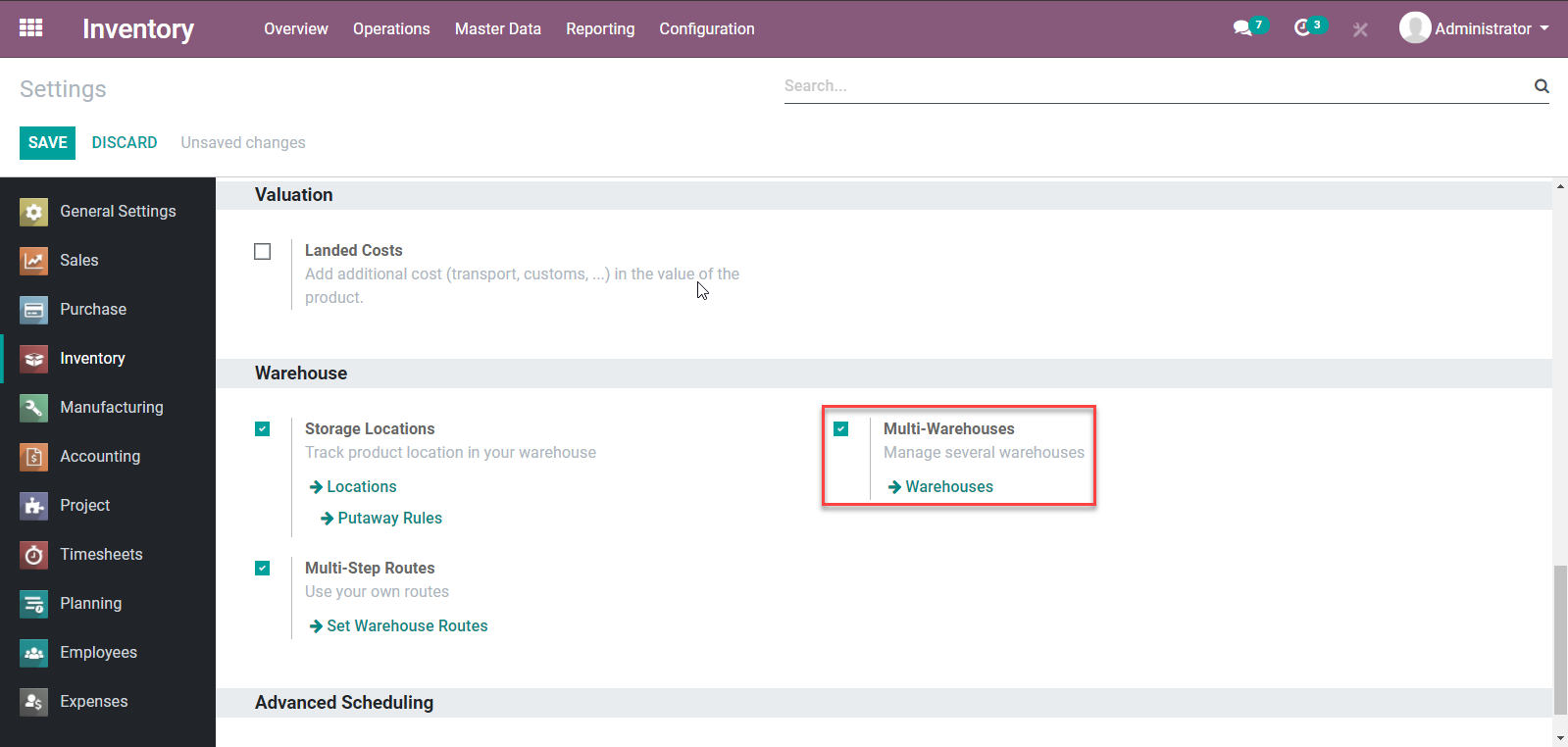 Truy cập: INVENTORY > Configuration > Setting, tại nhóm Warehouse, kích hoạt tham số Multiple Warehouse, sau đó nhấn Save.