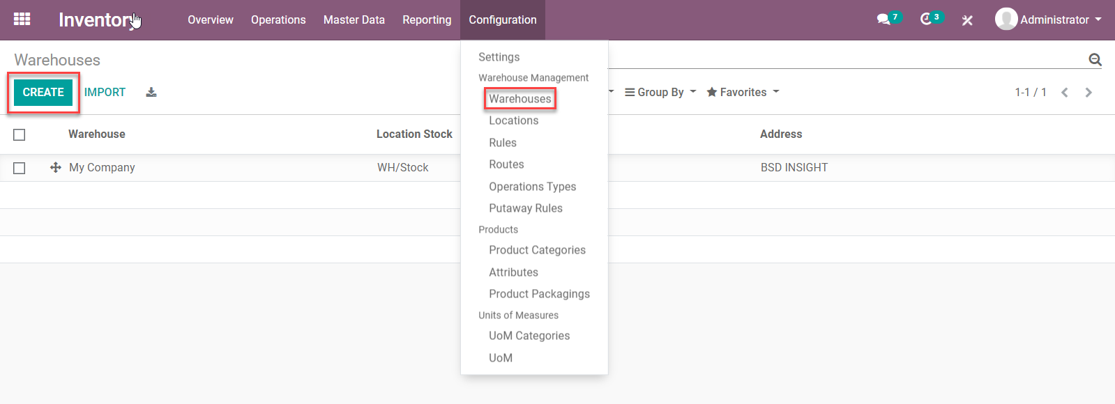 Truy cập: INVENTORY > Configuration > Warehouse, nhấn Create để tạo kho mới.