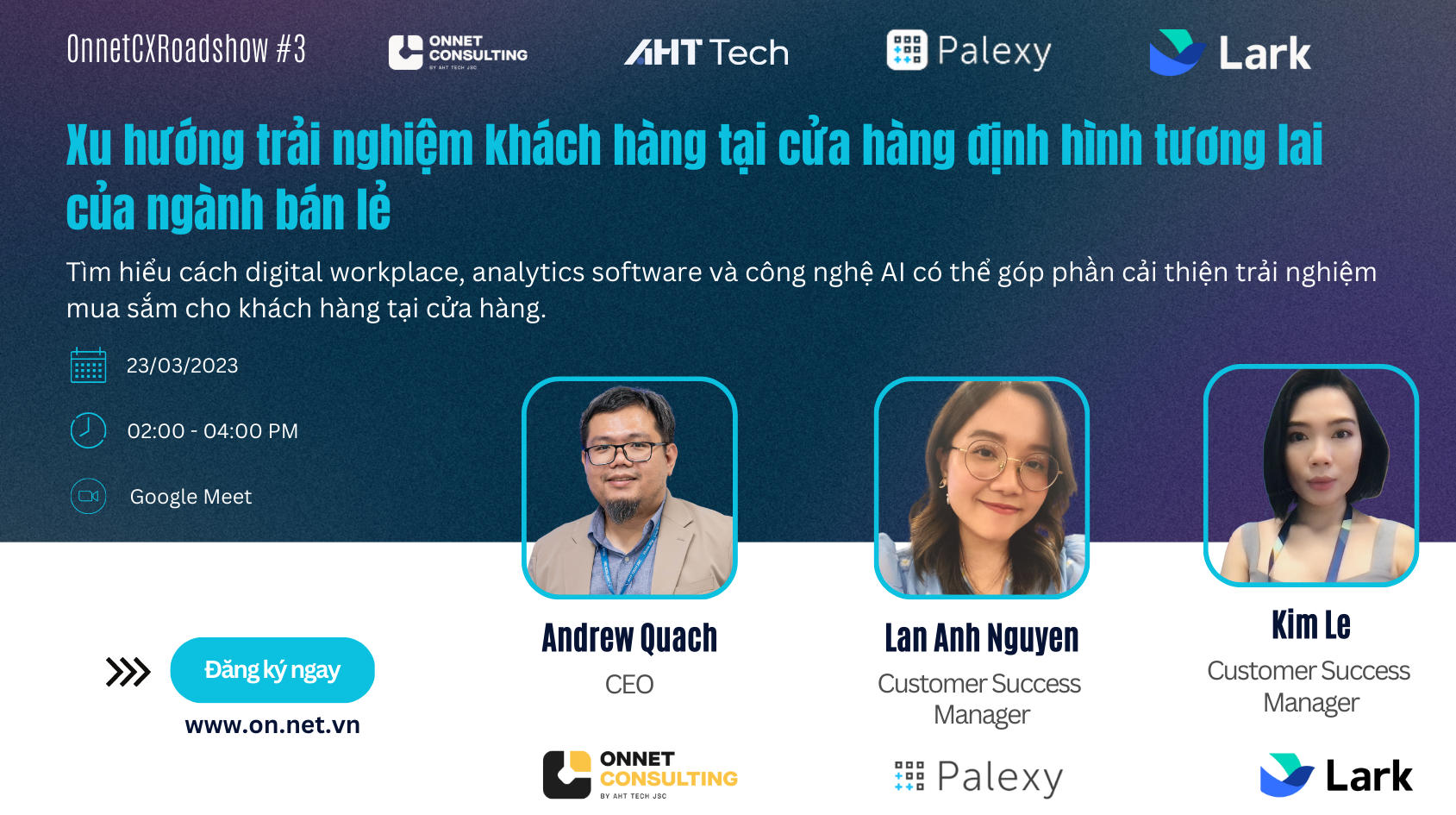 Đó là lý do tại sao Onnet Consulting, Palexy và Lark phối hợp cùng nhau thực hiện webinar "Xu hướng trải nghiệm khách hàng tại cửa hàng định hình tương lai của ngành bán lẻ", sự kiện nằm trong chuỗi #OnnetCXRoadshow.